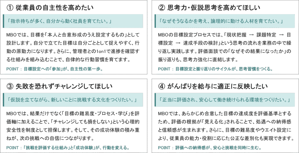 「自律的に動く社員を育てたい」「思考力を高めたい」「挑戦する文化をつくりたい」「がんばりを正当に評価したい」——よくあるお悩みに、MBOで応えます。