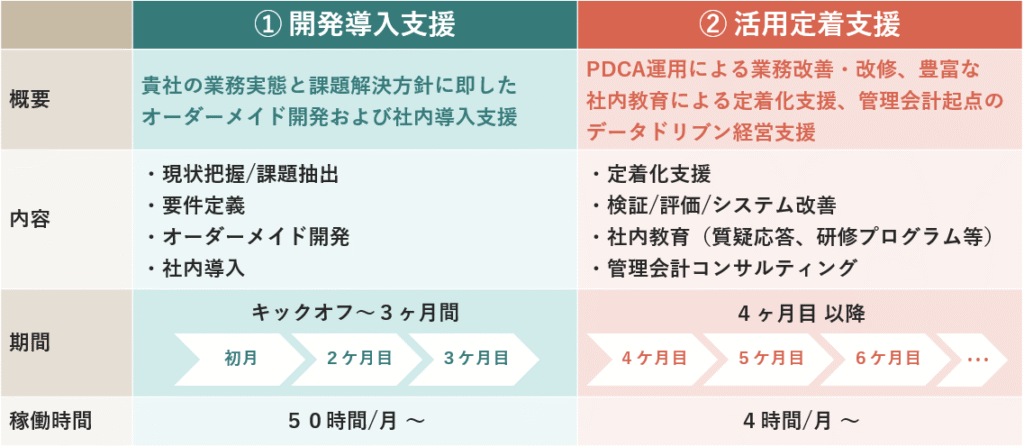 目的別に効果を最大化できるよう、2つのフェーズに分けてご支援しています。