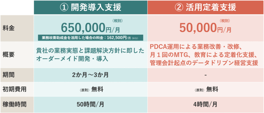 また、「①開発導入支援」は助成金活用をセットに設計いたします。